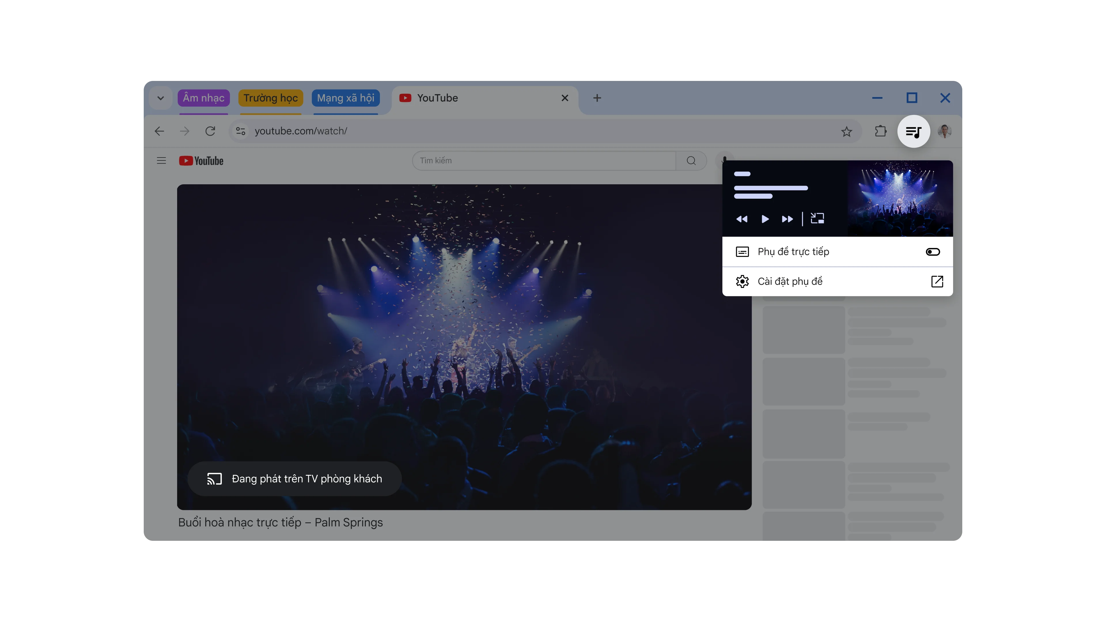 Google Cast và các nút điều khiển nội dung nghe nhìnXem theo cách bạn muốnNhờ có Chrome, bạn có thể truyền nội dung từ máy tính hoặc điện thoại sang TV bằng Google Cast tích hợp sẵn. Chọn truyền toàn bộ màn hình hay chỉ một thẻ cụ thể. Tìm hiểu thêm về tính năng